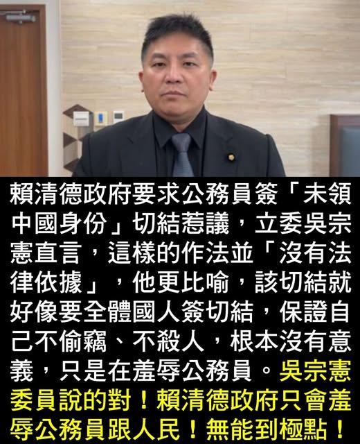 賴清德政府要求公務員簽「未領中國身份」切結惹議, 立委吳宗憲直言, 這樣的作法並「沒有法律依據」, 他更比喻, 該切結就好像要全體國人簽切結, 保證自己不偷竊、不殺人,根本沒有意義, 只是在羞辱公務員。 吳宗憲委員說的對! 賴清德政府只會羞辱公務員跟人民! 無能到極點!
