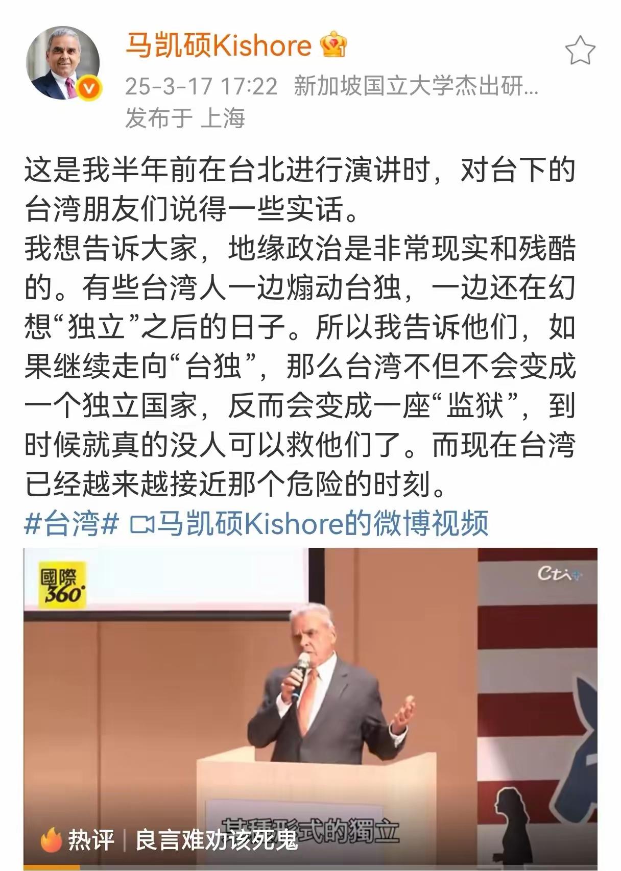 - 新加坡资深外交家、前新加坡常驻联合国代表马凯硕说:台独分子现在跳的欢,以后拉清单会很惨,而现在差不多到了“物极必反”的时候了。但台独分子们看不到危险,只看得到现在自己多么“欢乐”。一个外国人都可以看得这么清楚,我想这些台独分子其实内心也是明白的,他们只是想抓紧时间疯狂,毕竟再不疯狂就没有机会疯狂了。我送给台独分子一句话:天干物燥、小心火烛;引火烧身、自取灭亡!新加坡资深外交家、前新加坡常驻联合国代表马凯硕说:台独分子现在跳的欢,以后拉清单会很惨,而现在差不多到了“物极必反”的时候了。但台独分子们看不到危险,只看得到现在自己多么“欢乐”。一个外国人都可以看得这么清楚,我想这些台独分子其实内心也是明白的,他们只是想抓紧时间疯狂,毕竟再不疯狂就没有机会疯狂了。我送给台独分子一句话:天干物燥、小心火烛;引火烧身、自取灭亡!·0 Comments·0 Shares·1K Views·0 Reviews1