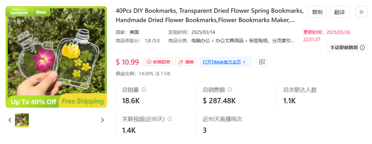 3月中旬上线DIY书签在TikTok爆火,一举冲上了TikTok美区商品热销榜,近7天卖出1.49万单,总销售额已突破28万美元。