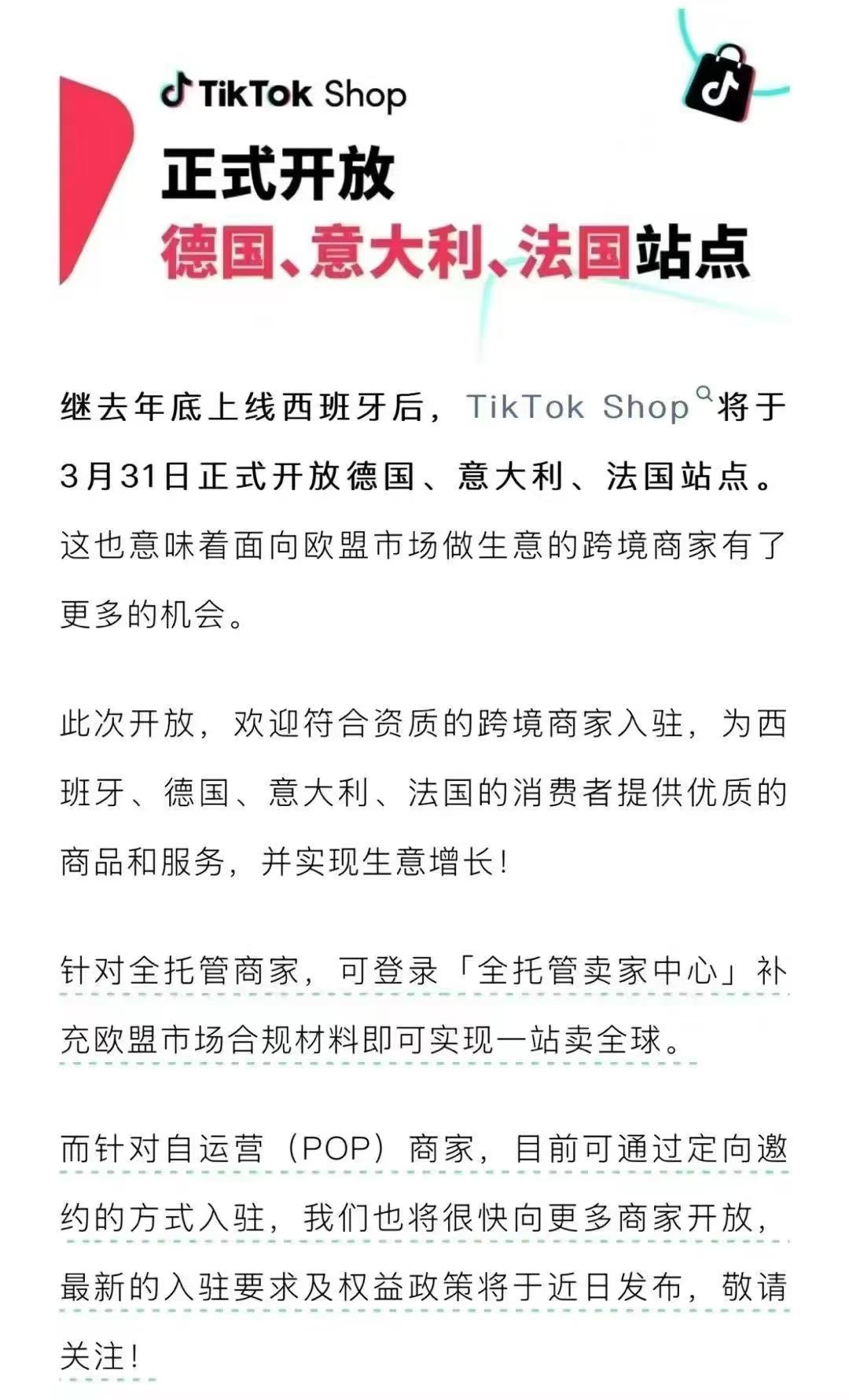 TikTok Shop正式开放德国、意大利、法国站点,这也意味着面向欧盟市场做生意的跨境商家有了更多的机会。