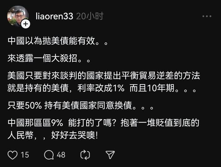 - 不知道這個傻逼知不知道債務折現的概念?就是債務價值等於 (本金+利息)/(1+r)^ n,如果利息變低了(利率降了),等於折現率r變小了,債券價值是會上升的,等於中國美債還賺錢了!更可以開心的拋了…但這樣玩,不明擺著跟全世界説我還不出去來嗎?你確定市場利率不會暴漲嗎?暴漲那些拿1%要瞬間虧好多錢啊!這裡面一定會有抬彎的啊!不知道這個傻逼知不知道債務折現的概念?就是債務價值等於 (本金+利息)/(1+r)^ n,如果利息變低了(利率降了),等於折現率r變小了,債券價值是會上升的,等於中國美債還賺錢了!更可以開心的拋了…但這樣玩,不明擺著跟全世界説我還不出去來嗎?你確定市場利率不會暴漲嗎?暴漲那些拿1%要瞬間虧好多錢啊!這裡面一定會有抬彎的啊!·0 Comments·0 Shares·2K Views·0 Reviews1