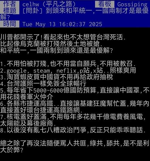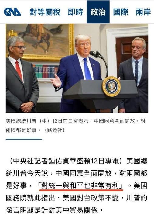 不過台獨夢,早晚都得醒的,早醒總比晚醒好!最近綠蛙的心情應該壞得很! 首先是印巴交戰。 中國的殲10c把法國陣風打成6:0。 綠蛙發現解放軍原來是真老虎,不是紙老虎。 而且殲10c在解放軍𥚃只排第六,這可着實把綠蛙給嚇壞了! 接下來是,中美在瑞士做關稅談判,結果美國輸了,大陸贏麻了。 大陸硬是逼川普退回4月2日宣布對等關稅前的狀態,現在若扣除芬太尼因素的20%,大陸商品的關稅只剩下10%。 綠蛙開始怪賴清德。 那麼早,那麼急的下跪幹嘛? 跪得一點價值都沒有,還被川普嫌髒嫌臭,看不起,最後被榨的乾亁淨淨。 昨天川普在白宮記者會講實話了。 他說中美經貿磋商和解,有助於兩岸和平統一。 其實我早說過,川普內心就是想把台灣交易給大陸的。 只是他認為台灣現在還有台積電,還有錢,還有些價值。 所以在想方設法把台灣先榨乾,再交易出去。 這個爆炸消息一出來,綠蛙的三魂七魄都嚇掉了。 原來台獨是不可能的夢,原來台獨是一條死路。 綠蛙真是慘啊,誰叫他活該被台獨金孫騙。 不過台獨夢,早晚都得醒的,早醒總比晚醒好!·0 Comments·0 Shares·28K Views·0 Reviews1