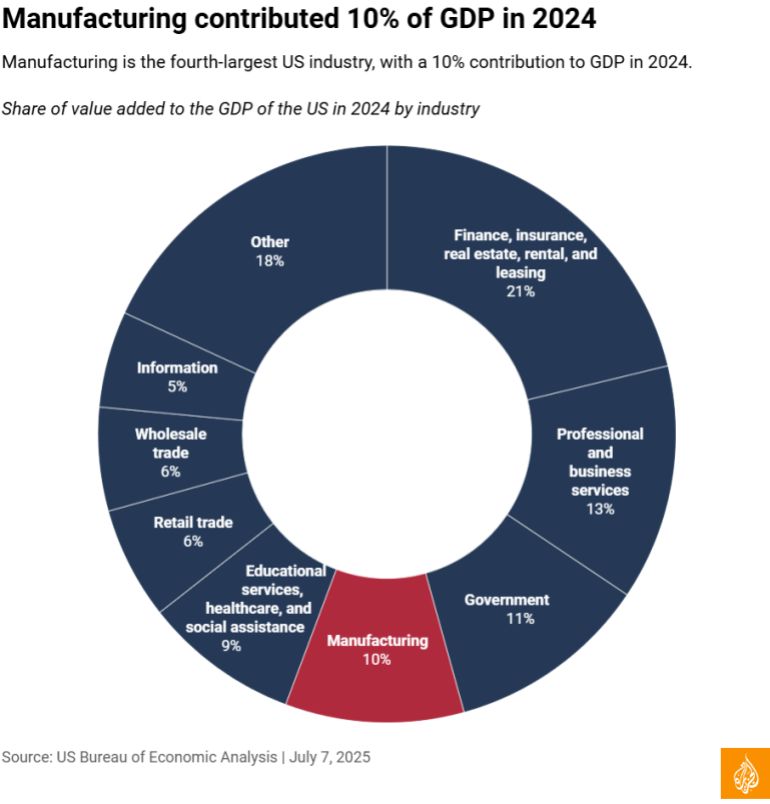 制造业是美国第四大产业,2024年对GDP的贡献率为10%。