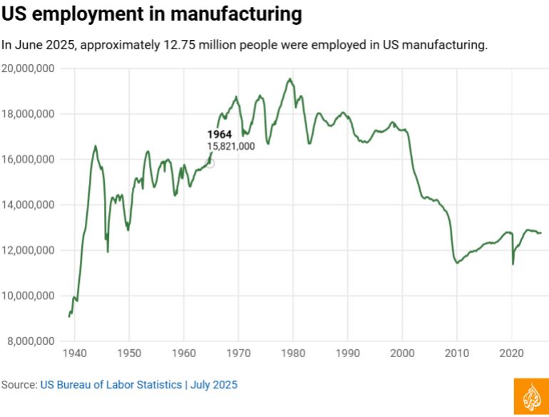 截至2025年6月,美国制造业就业人数约为1275万人。