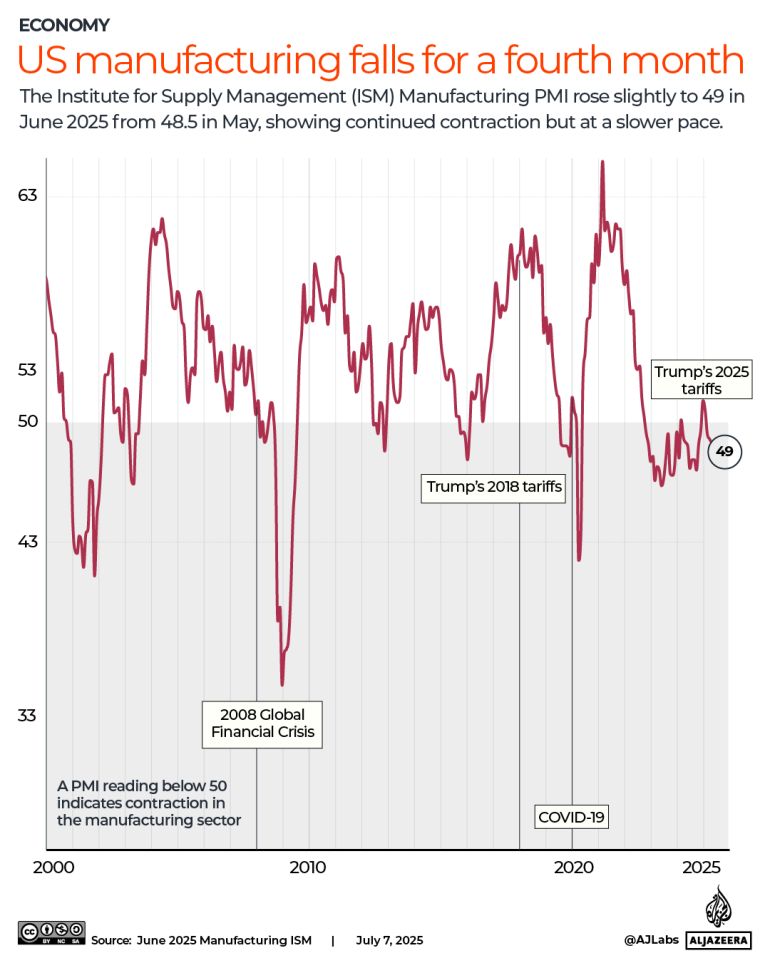 美国供应管理协会(ISM)制造业PMI指数从5月份的48.5小幅上升至6月份的49,表明制造业继续萎缩,但萎缩速度有所放缓(半岛电视台)