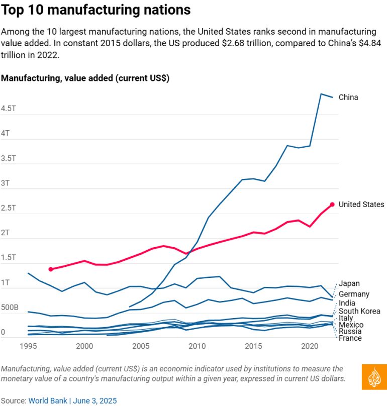 美国在全球制造业中的份额有所下降,而中国已成为按附加值计算最大的制造业国家。