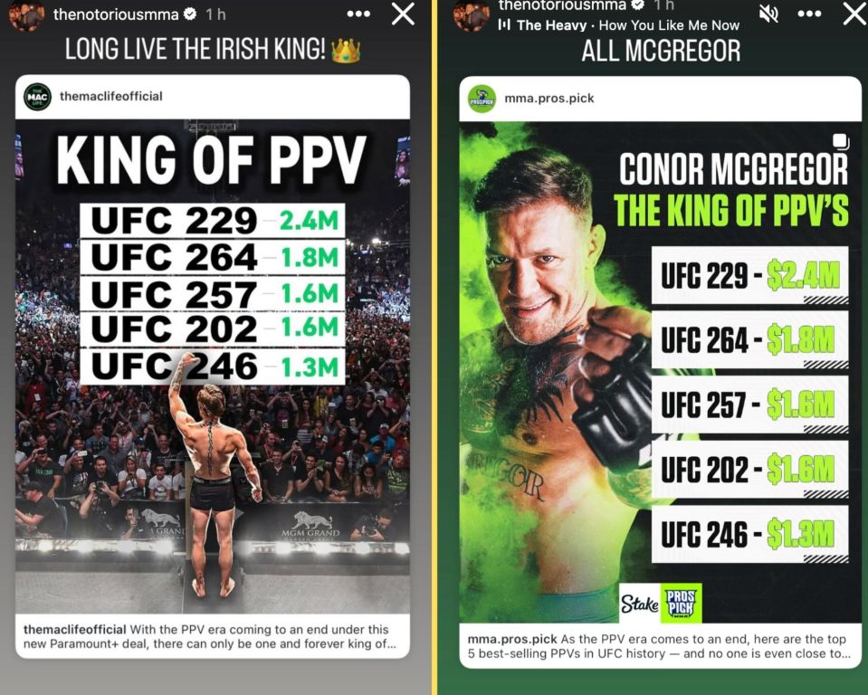 “Long live the Irish king,” McGregor wrote on Instagram, responding to a graphic showing his role in generating over $1 billion in combined PPV buys in his 14-fight UFC career.
