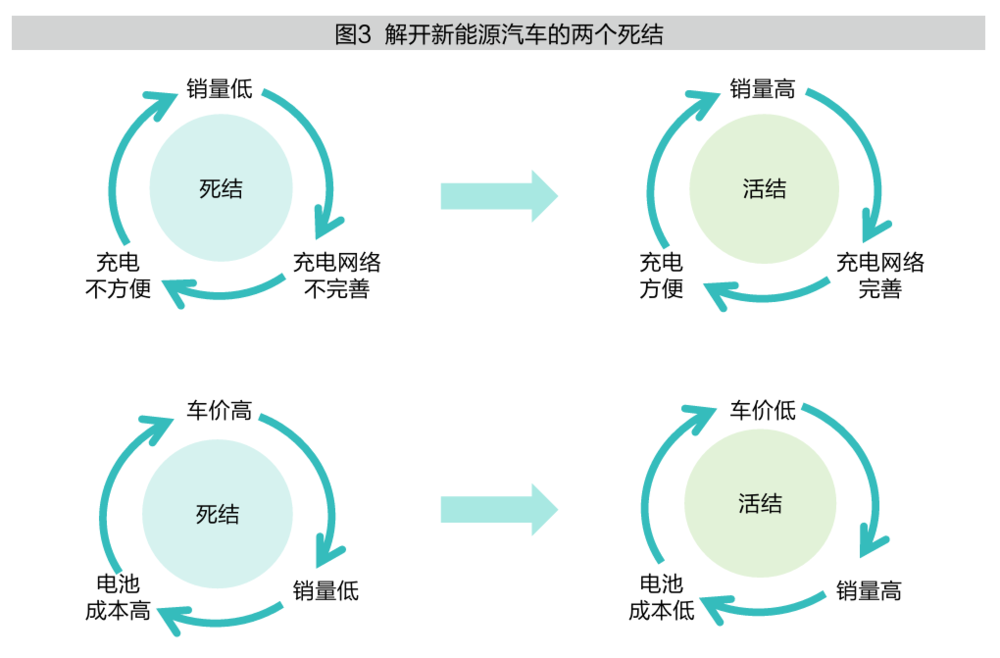 新能源汽车电池价格和充电网络是影响顾客购买行为的主要因素。如图3所示,充电网络不完善和电池成本高是制约新能源汽车发展的两个死结:一方面,电池成本高导致新能源汽车价格高,直接影响汽车销量;另一方面,充电网络基础设施不完善导致充电不方便,也直接影响汽车销量。为了打破死结,许多车企都在探索适合自己的补能商业模式。进入补能新时代后,越来越多的新能源汽车企业、充电服务企业及高科技企业开始布局超充市场。例如,2024年华为率先提出计划在全国340多个城市部署超过10万个全液冷超快充充电桩。