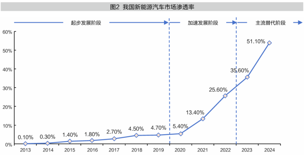 据有关统计数据显示,我国新能源汽车的市场渗透率从2013年的0.1%显著增长至2023年的35.6%,到2024年9月更跃升至51.10%(见图2)。这反映出该行业的发展已从初期起步阶段过渡到加速发展阶段,并进一步迈入主流替代阶段。