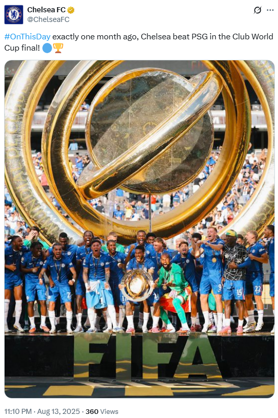 The Blues sent out a message reading: “#OnThisDay exactly one month ago, Chelsea beat PSG in the Club World Cup final!”
