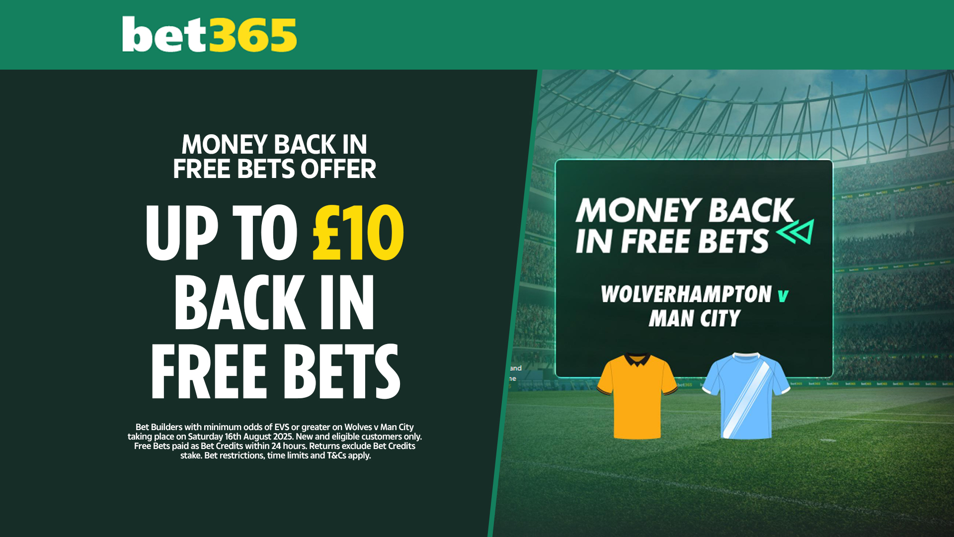 And Bet365 are offering new and eligible customers Money Back in Free Bets, up to £10 when you bet on Wolves vs Man City.