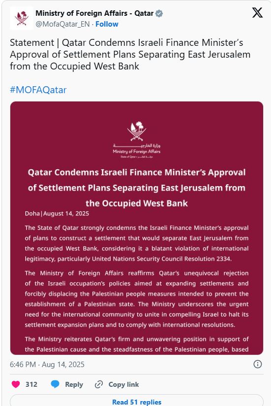 卡塔尔外交部谴责这一行动,称其“再次表明卡塔尔坚决反对以色列占领当局旨在扩大定居点和强行驱逐巴勒斯坦人民的政策,这些措施意图阻挠巴勒斯坦国的建立”。