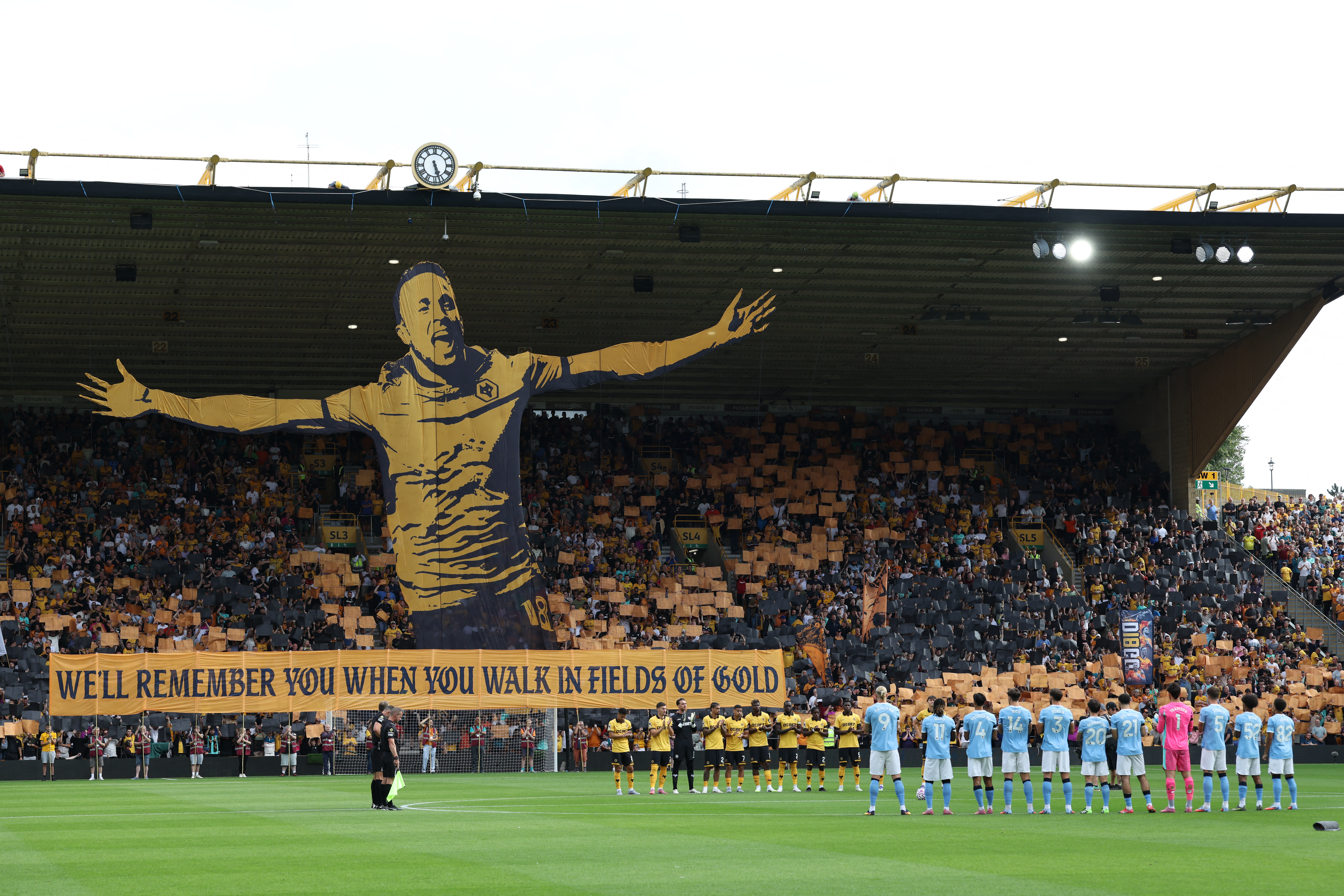 A large tifo of Jota was displayed before kick-off with a banner that read ‘We’ll remember you when you walk in fields of gold’.