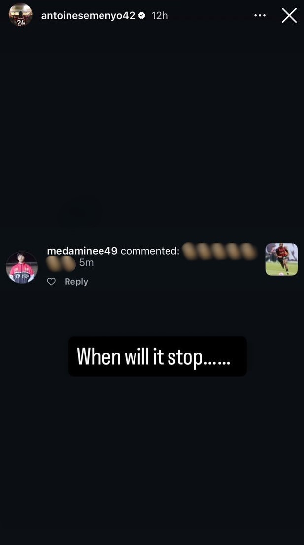 After the game, Semenyo took to his Instagram story and exposed a string of monkey emojis posted by a social media user under one of his previous posts, alongside the caption: “When will it stop?”