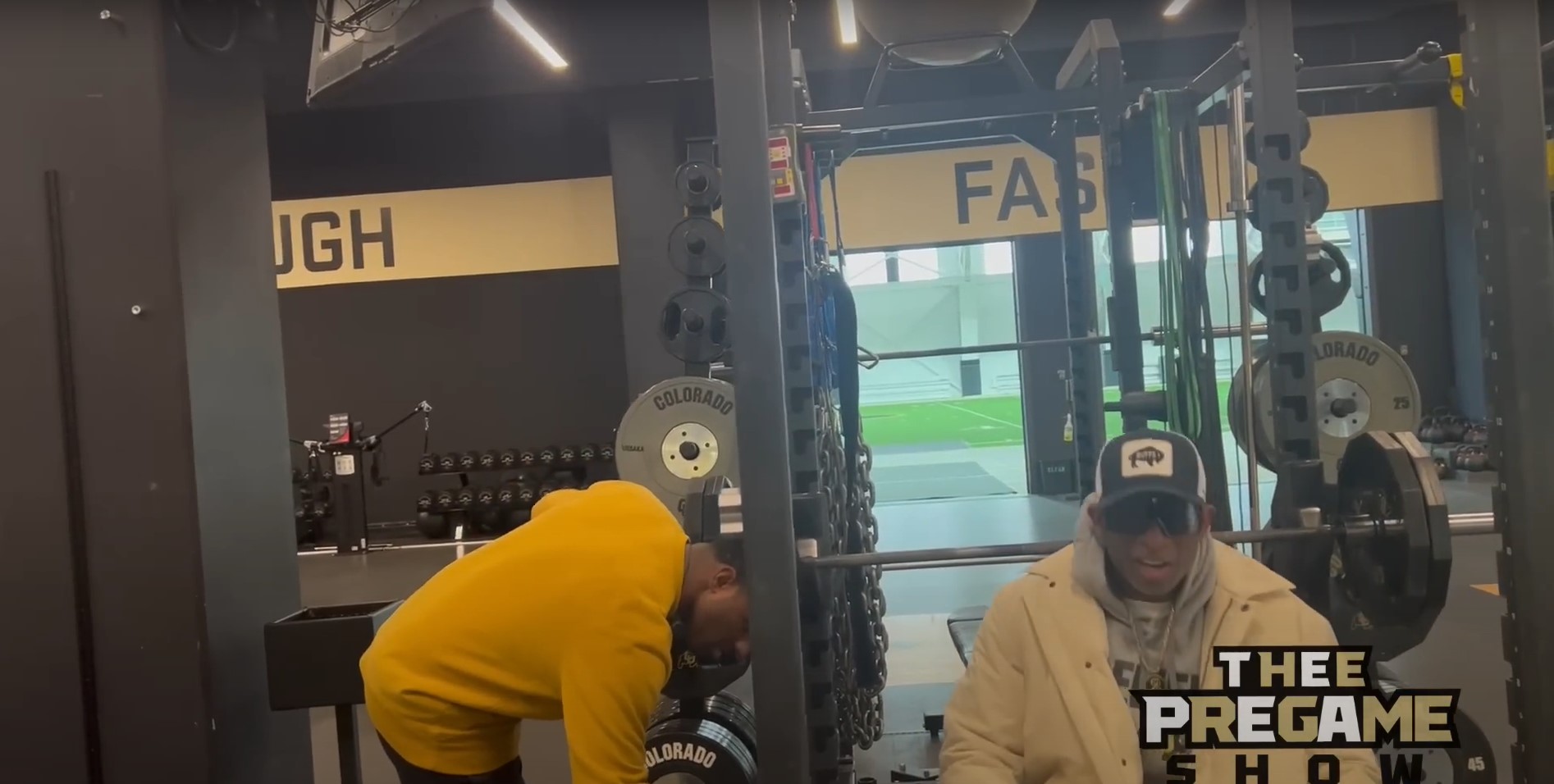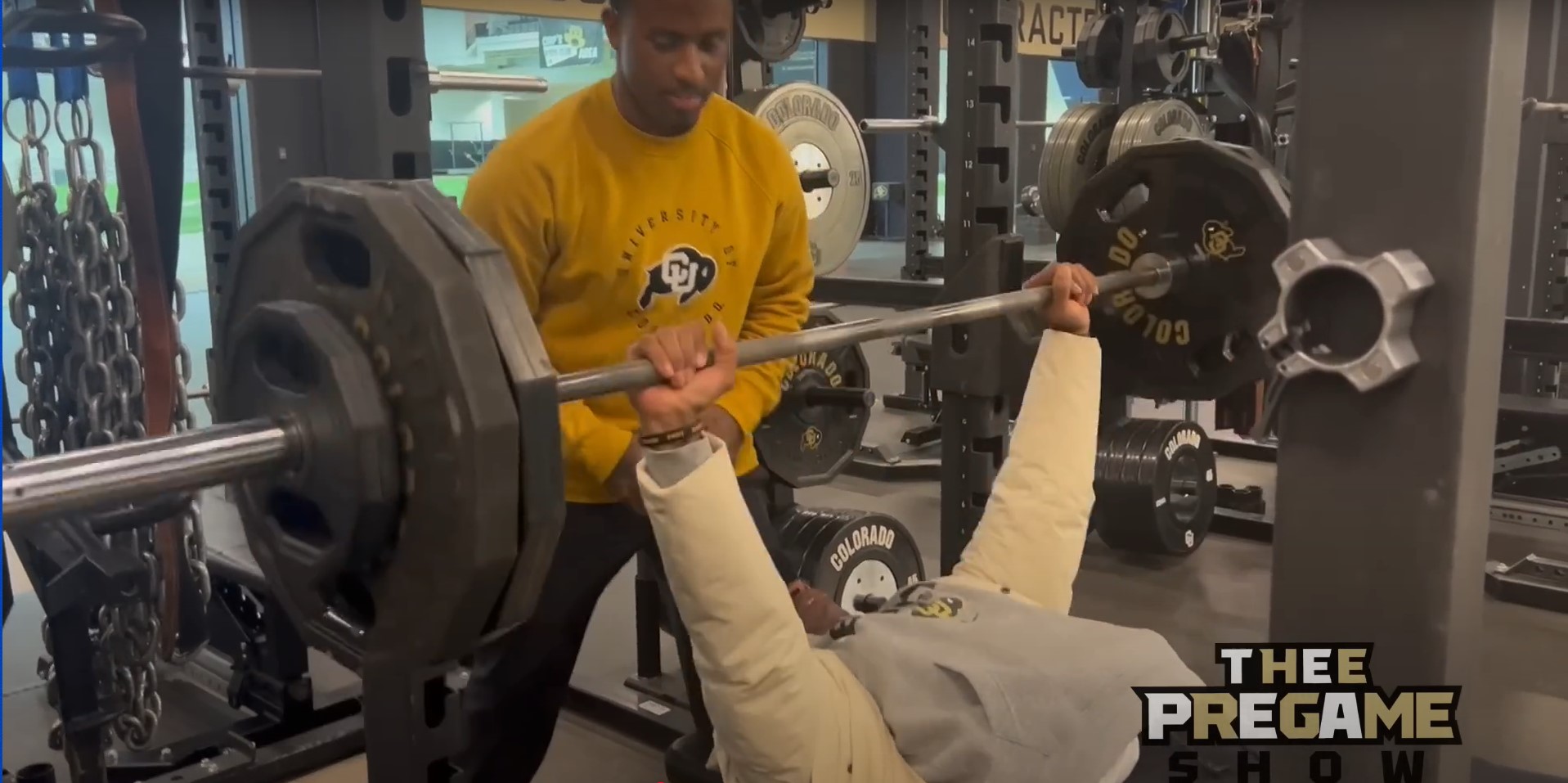 Despite not warming up and wearing a hoodie, winter jacket, gold chains, a hat, and sunglasses, Coach Prime threw up six reps of 245 pounds.