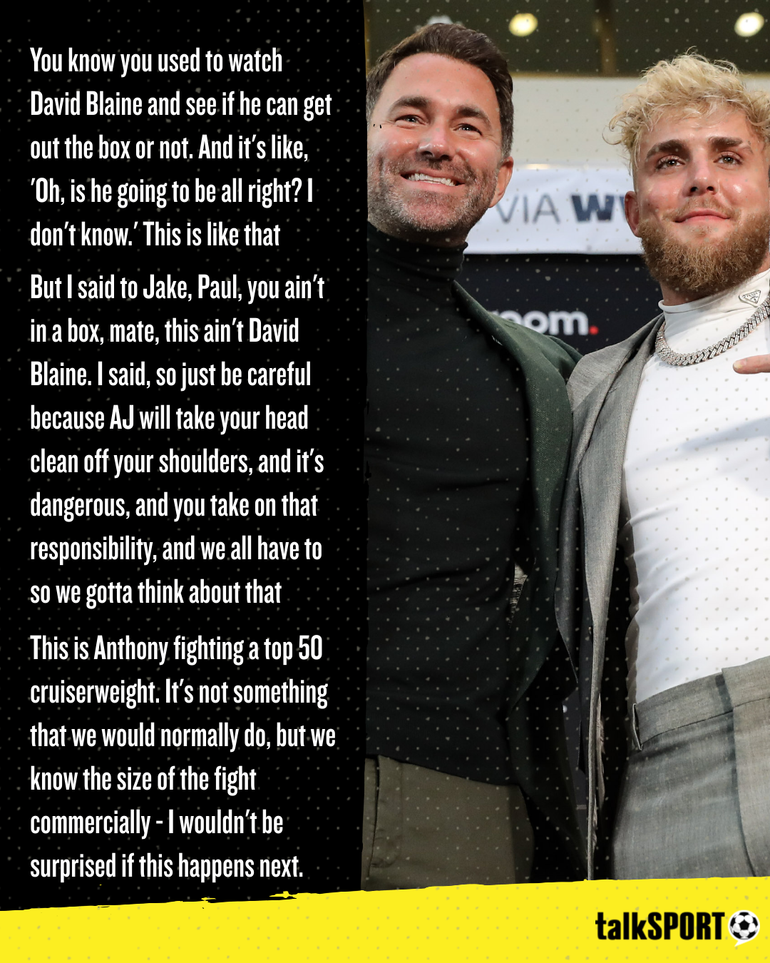 “But I said to Jake, Paul, you ain’t in a box, mate, this ain’t David Blaine. I said, so just be careful, because AJ will take your head clean off your shoulders, and it’s dangerous.