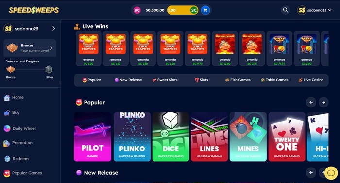Once your account is created, Speed Sweeps’ simple interface is easy to navigate. The platform includes several categories to narrow down the game selection. Choose from slots, fish games, table games, live casino, new releases, and popular titles.
