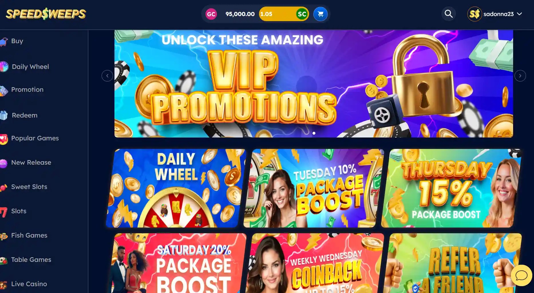 - Purchase deals: Explore a first purchase offer at Speed Sweeps plus package boosts on select days.
