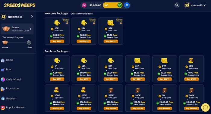 - Gold Coin packages: Speed Sweeps also includes a Coin Store where you can purchase GCs and earn free SCs. Packages start at just $5.99 and include several ways to build up your coin total.