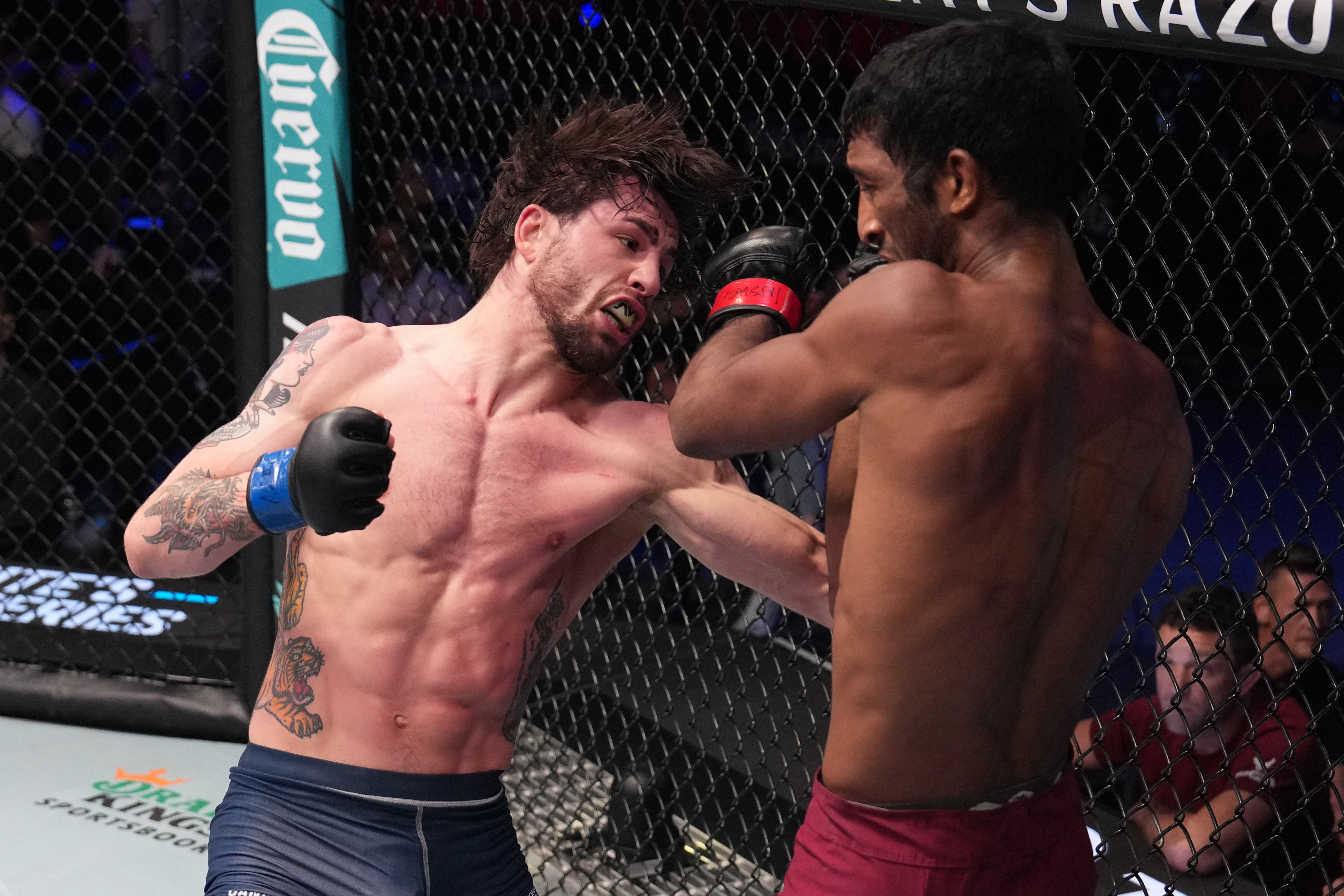Then, midway through the final round, Scott cracked Saikumar with a lethal combo and rushed over to his wounded opponent against the cage to finish the fight.