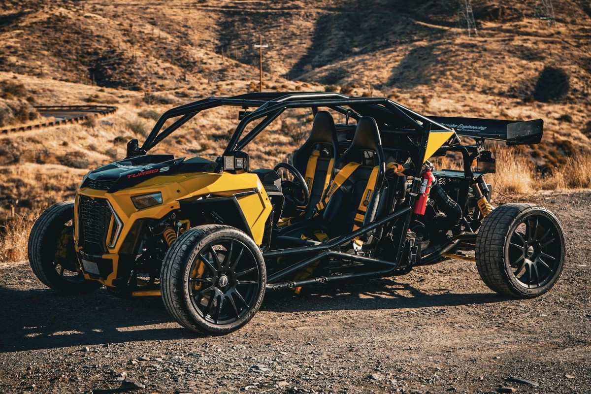 The vehicle in question is a 2018 Polaris RZR XP Turbo S, heavily reworked under the guidance of Porsche Engineering. Power still comes from the 925cc turbocharged two-cylinder producing 168 horsepower and 114 lb-ft of torque, but the standard drivetrain has been converted to rear-wheel drive. Other changes include 18-inch ALUTEC wheels, a custom KW suspension system, and front brake calipers sourced from a Porsche Cayenne S. The stopping system is further reinforced with Audi R8 brake rotors and Volkswagen Passat front hubs.