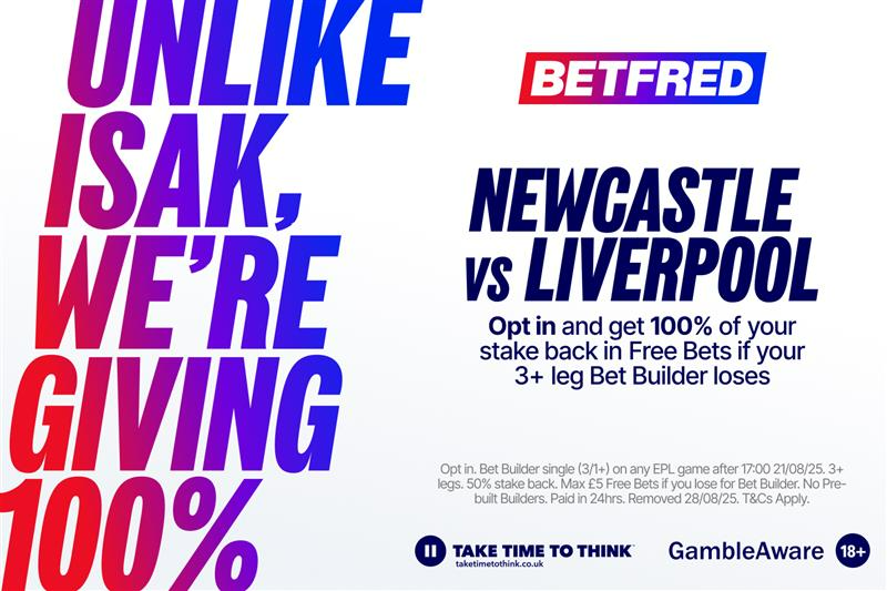 And Betfred are offering all eligible customers 100% stake back in free bets up to £10 if your bet builder of 3+ legs (min 3/1 odds) on Newcastle vs Liverpool loses!