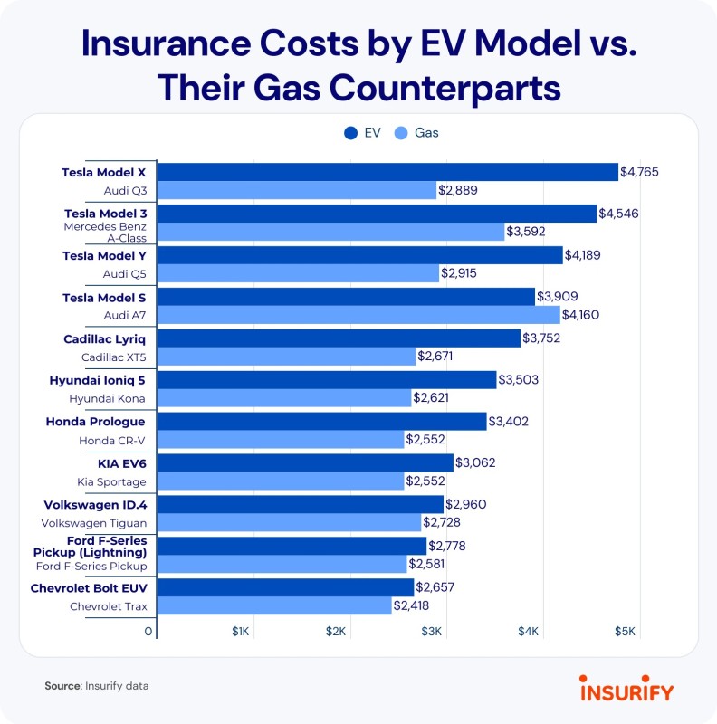 Four Teslas - the Model X, Model 3, Model Y, and Model S - are the most expensive EVs to insure. Only the Model S, at $3,909, is below the $4,000 mark among the four models on Insurify’s list. Since Tesla doesn’t make ICE vehicles, Insurify compared them with similar vehicles for its insurance cost analysis. Among these comparisons, only the Model S compared to an Audi Q7 is cheaper to insure than its gas-powered counterpart.