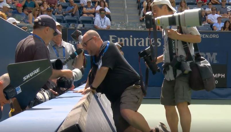 The male individual tripped over the advertising hoarding inside the Louis Armstrong Stadium.