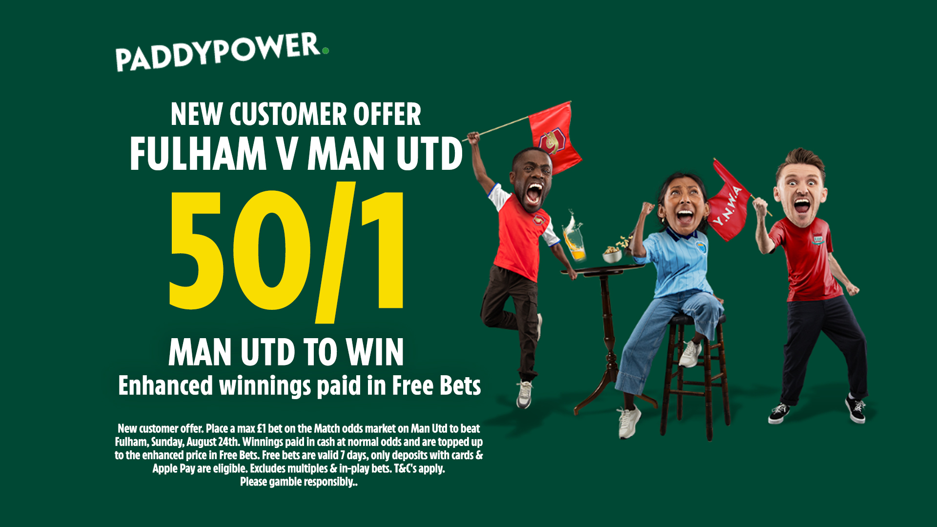 *New customer offer. Place a max £1 bet on the Match odds market on Man Utd to beat Fulham, Sunday, August 24th. Winnings paid in cash at normal odds and are topped up to the enhanced price in Free Bets. Free bets are valid 7 days, only deposits with cards & Apple Pay are eligible. Excludes multiples & in-play bets. T&C’s apply. Please gamble responsibly..