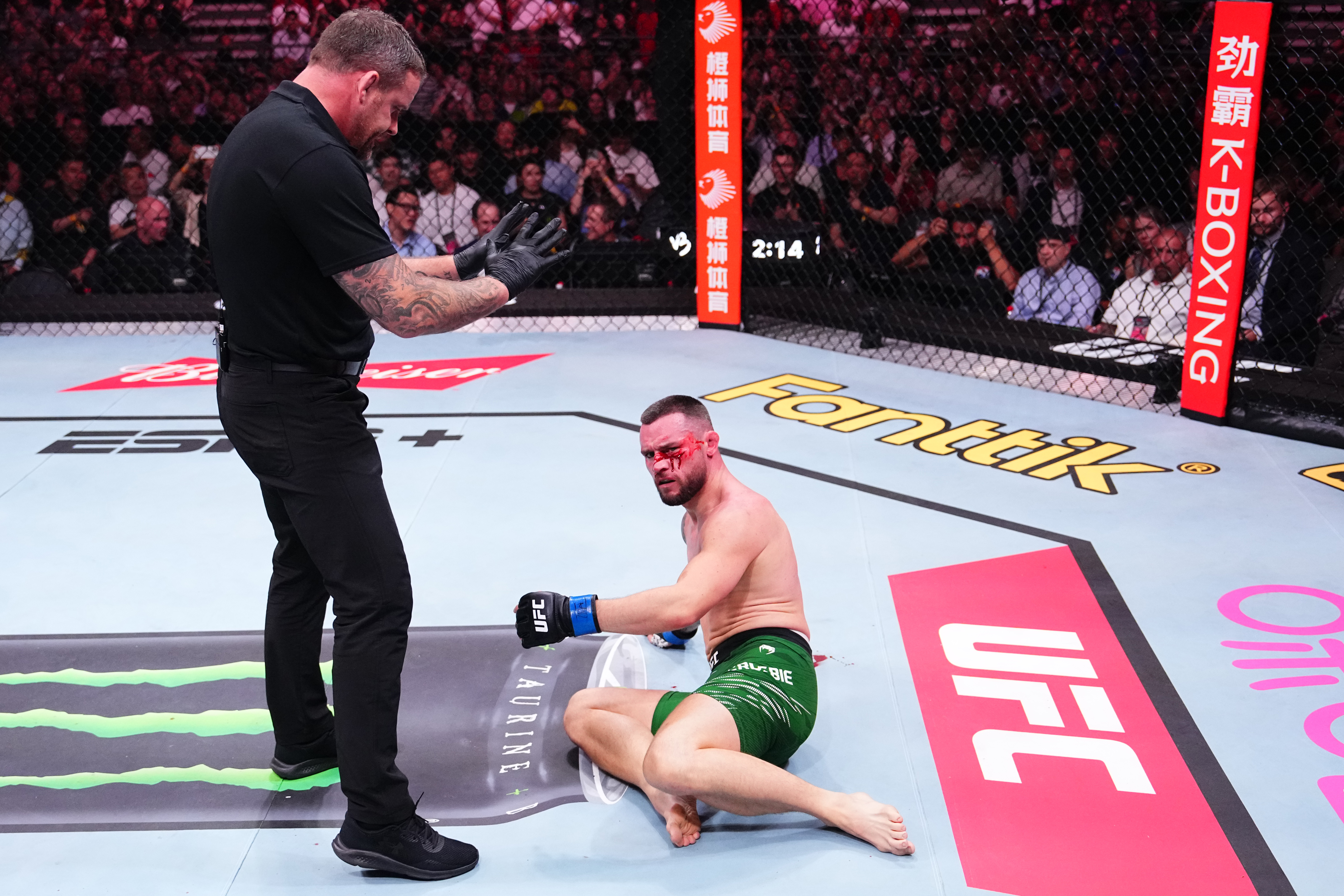 Nueraji was subsequently deducted two points for the illegal move, while Crosbie showed his warrior spirit by confirming he was good to continue the fight.