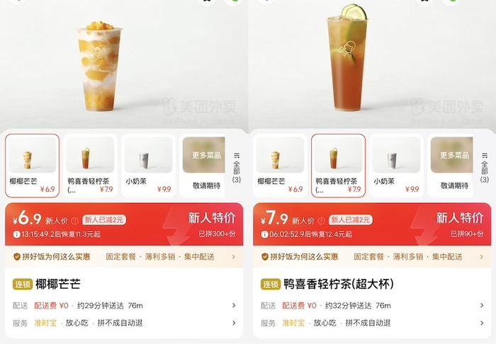 界面新闻在美团拼好饭页面看到,目前喜茶上线的产品集中在椰椰芒芒、鸭屎香青柠茶、小奶茉等经典产品,折后价格在6.9-9.9元区间,是常规零售价的6折左右。喜茶的拼好饭主要集中在如广东清远、湖北襄阳等下沉市场,而北上广深等城市暂未显示有喜茶拼好饭项目。