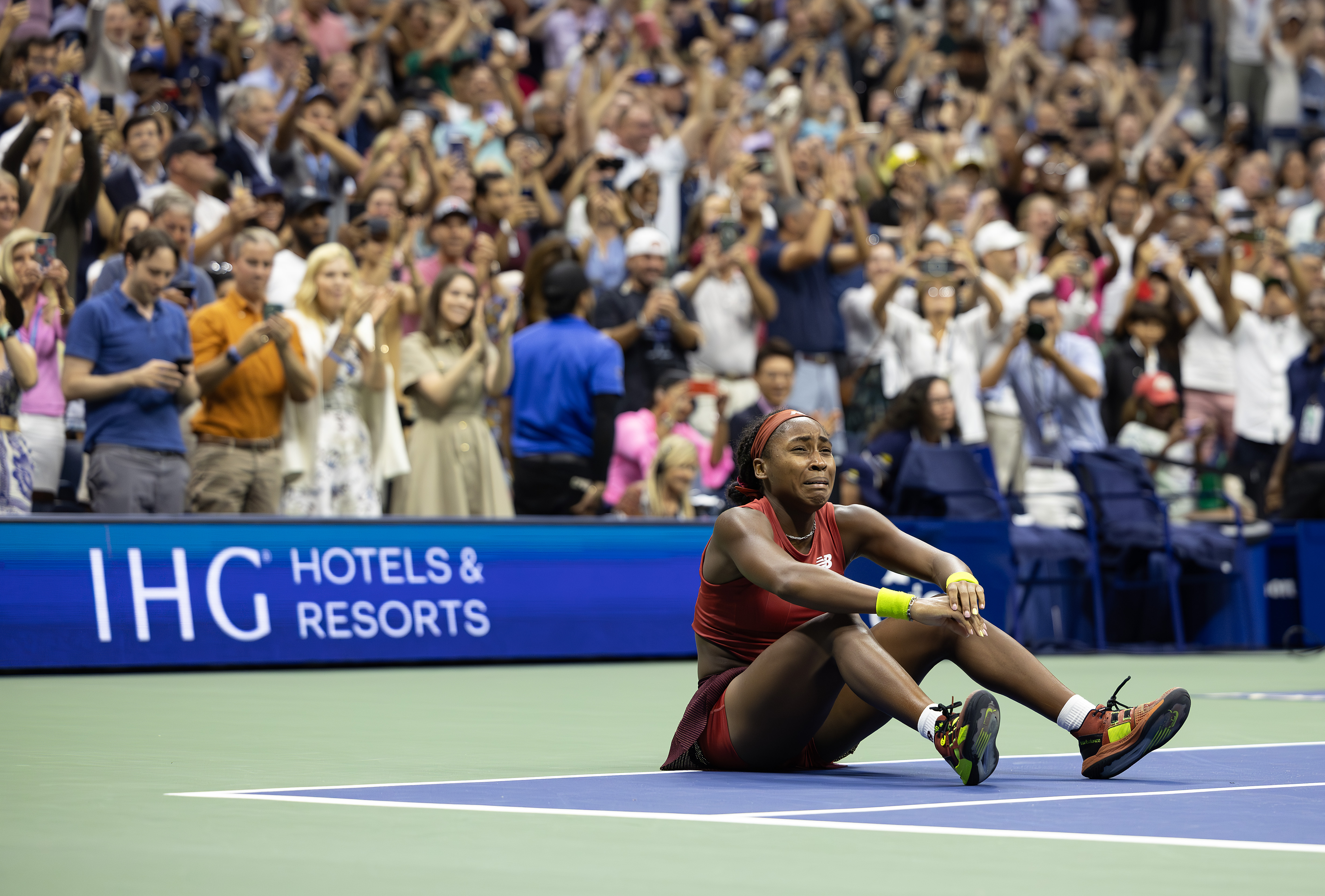The teenager was understandably emotional as she wrapped up a spectacular victory, and collapsed to the floor as the home crowd rose to their feet around her.