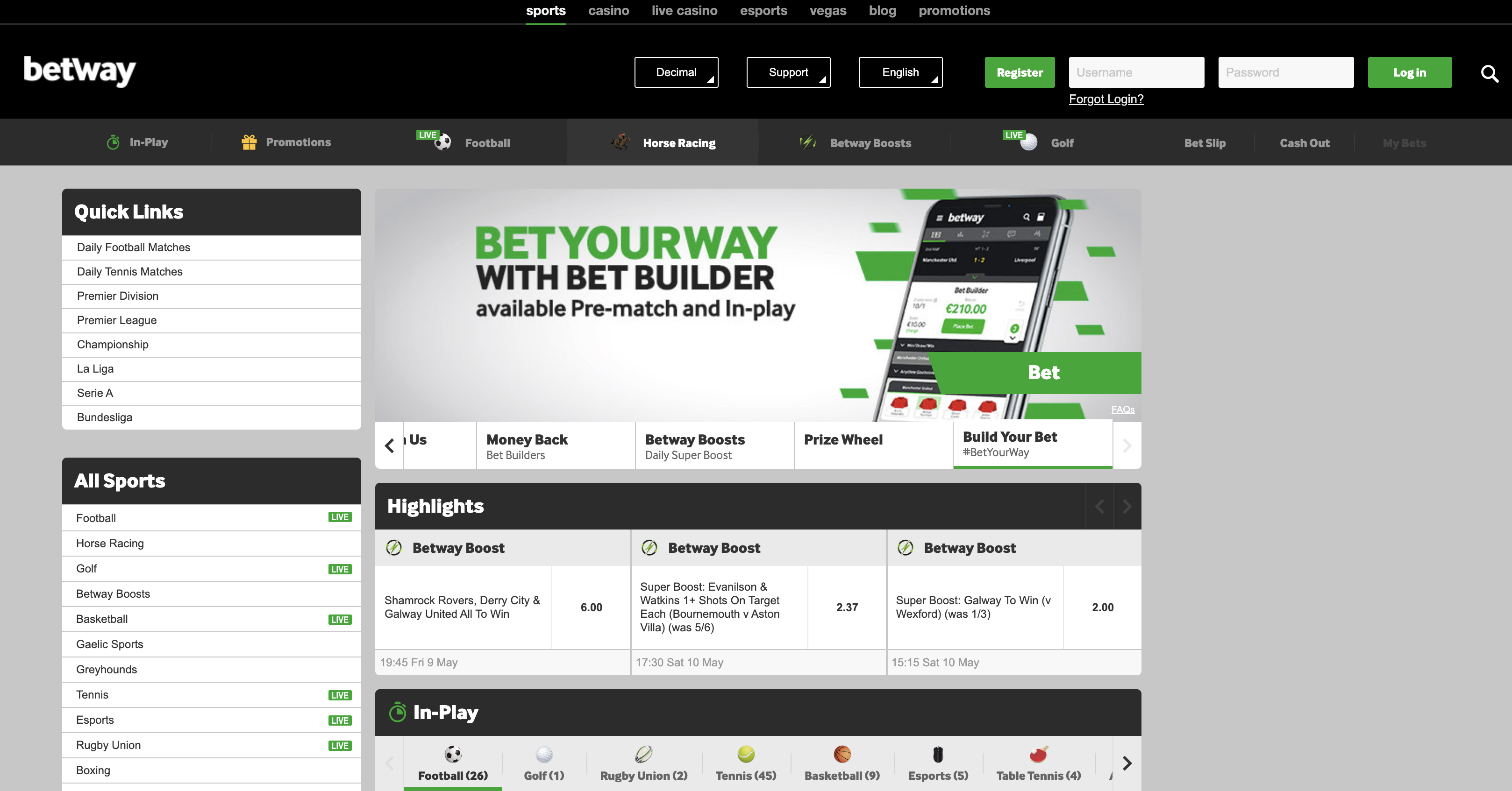 Betway lists over 30 sports, and while there may be more elsewhere, the platform offers the most popular options along with a good range of niche markets. Football and horse racing remain the focus for most bettors, while there’s also boxing, rugby, tennis, golf and more.