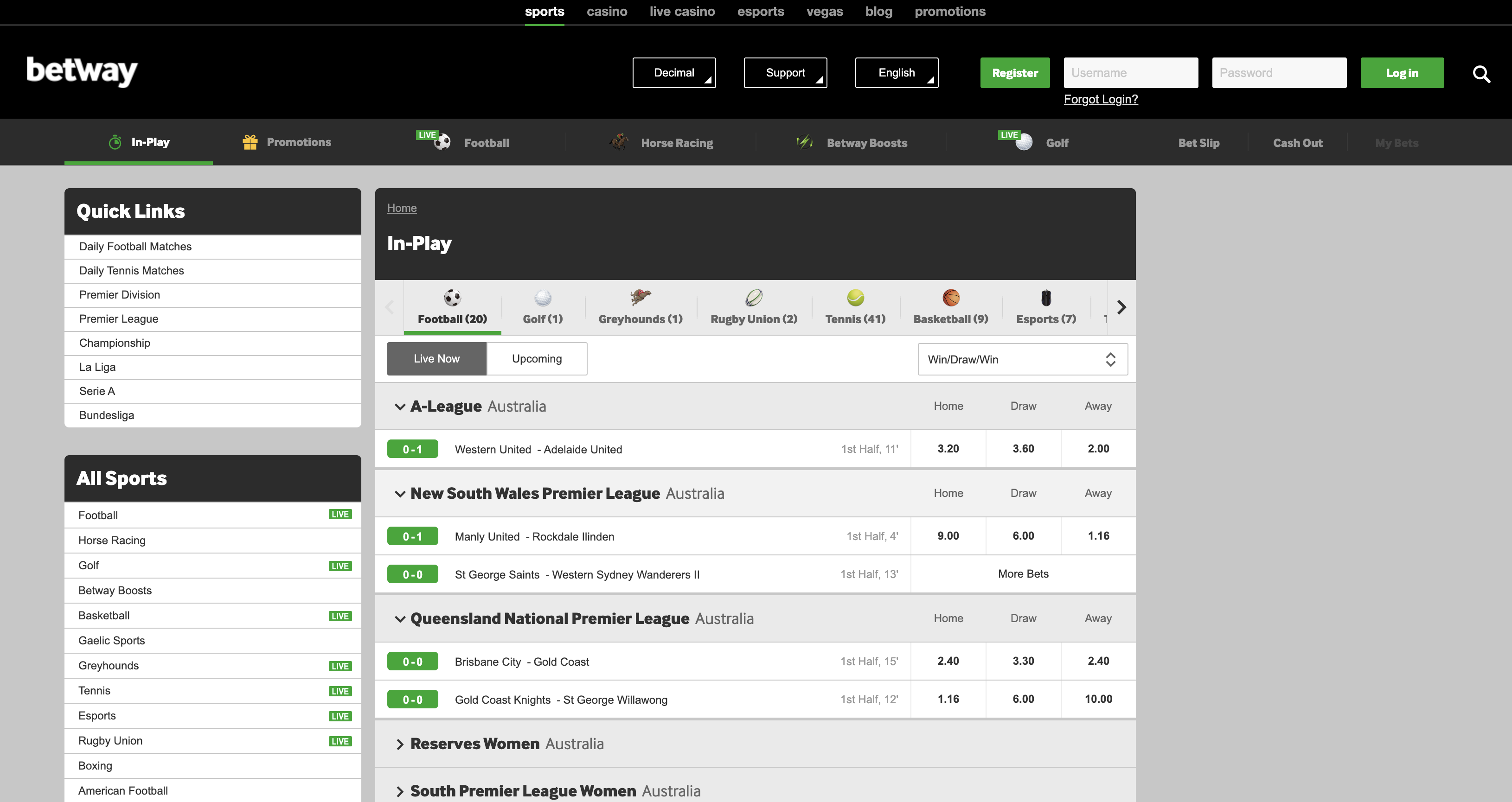 Betway are competitive in all core sports and will often have best prices for side markets. Within the live betting sphere, they can also compete with the more recognised players in this specialist area of the industry.