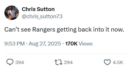 “Can’t see Rangers getting back into it now,” he joked on X.