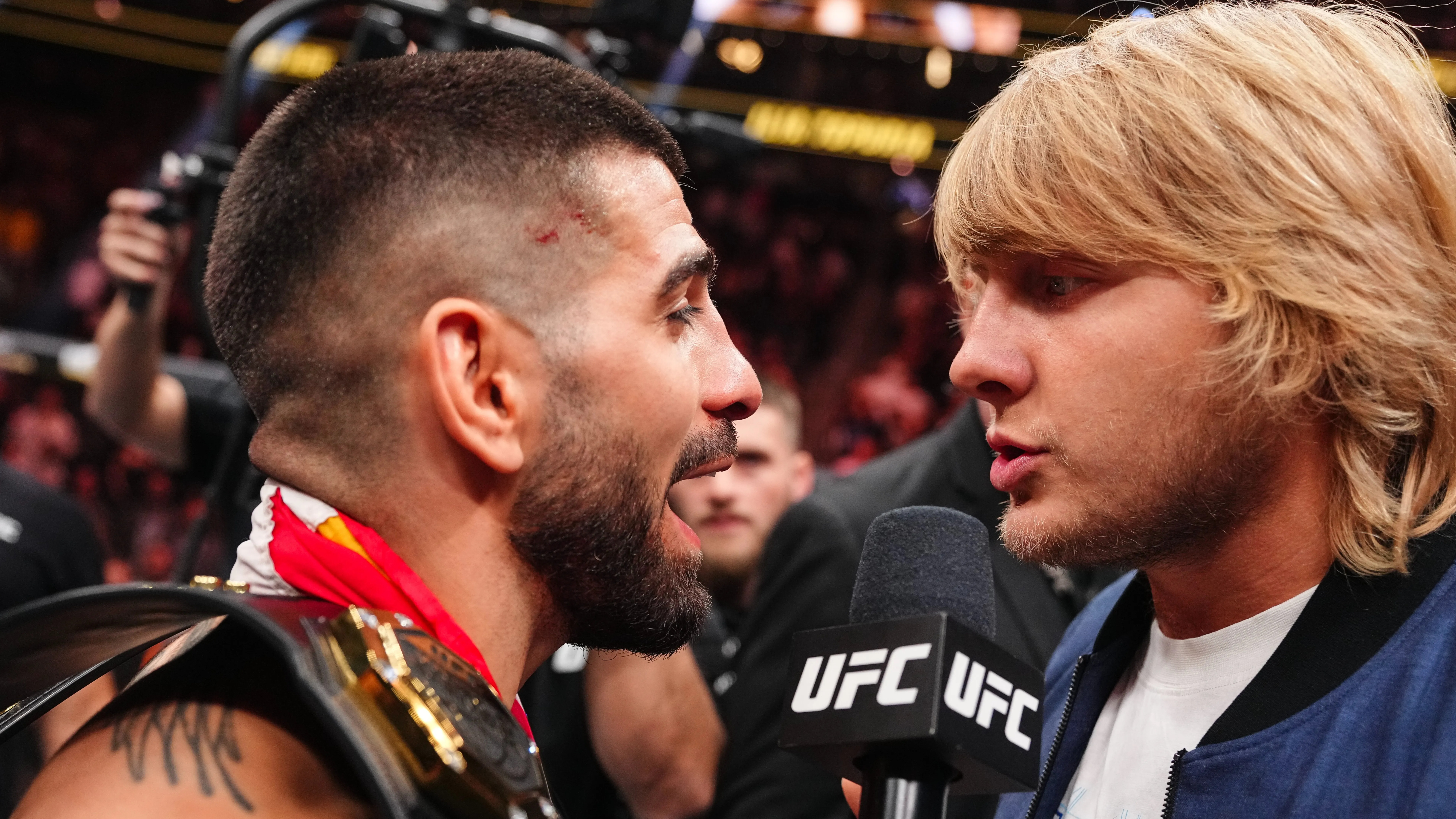 Topuria knocked out Charles Oliveira inside the opening stanza at UFC 317 to claim the vacant strap before Pimblett stormed the cage to confront his bitter rival.
