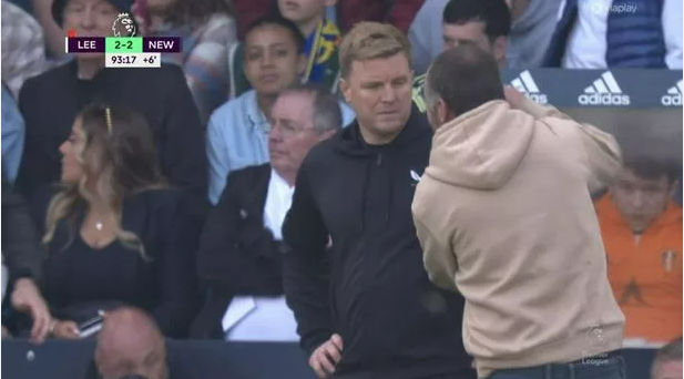 With the game coming to an end, Howe was standing on the touchline when a Leeds fan somehow got through security to confront him.