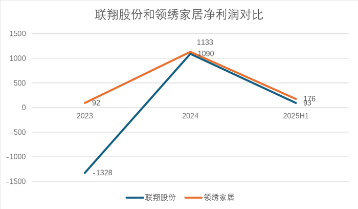 但到2024年,装修业务营收飙升至7145万元,较2023年增长6252万元 —— 这一增长额甚至超过了公司全年营收的总增长额(2024年营收较2023年增加5916万元)。净利润方面,领绣家居2024年实现净利润1133万元,成为联翔股份全年扭亏为盈的核心力量,若剔除装修业务利润,公司主业仍处于亏损状态。