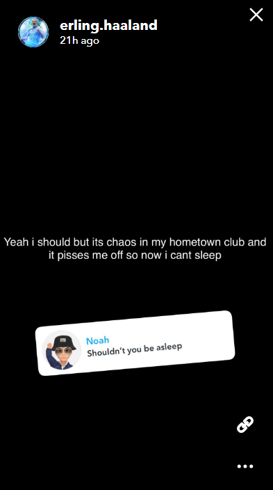 Haaland took the message and replied: “Yeah I should but it’s chaos in my hometown club and it p****s me off so now I can’t sleep.”