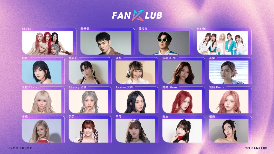 FANKLUB 首波進駐陣容橫跨知名歌手、潮流新秀及啦啦隊成員等共計 20 組藝人,包括金曲歌王蕭煌奇、全能男神黃偉晉、主打潮流音樂能量的女團新秀 ELL&s,以及將於月底正式出道並發單曲的全新混聲團體 B CRUSH 不小心製造;此外也集結多位啦啦隊代表,包含擁抱音樂夢想的楊曉帆、小紫、禾羽 Kimi,勇於突破挑戰自我的壯壯與琳妲,以及由職籃啦啦隊成員組成、以帥辣風格為亮點的女團 MEME(小楓、筱緹、草莓、笑笑、安汝),展現跨界魅力,名單將持續增加並計畫於 10 月推出第一波獨家寵粉活動。