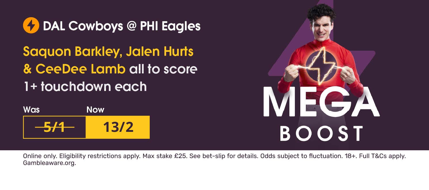 And Tote are offering boosted odds ahead of the curtain raiser for Saquon Barkley, Jalen Hurts and CeeDee Lamb all to score a touchdown, which is now available at 12/2 (up from 5/1) and can be added straight into your betslip here.