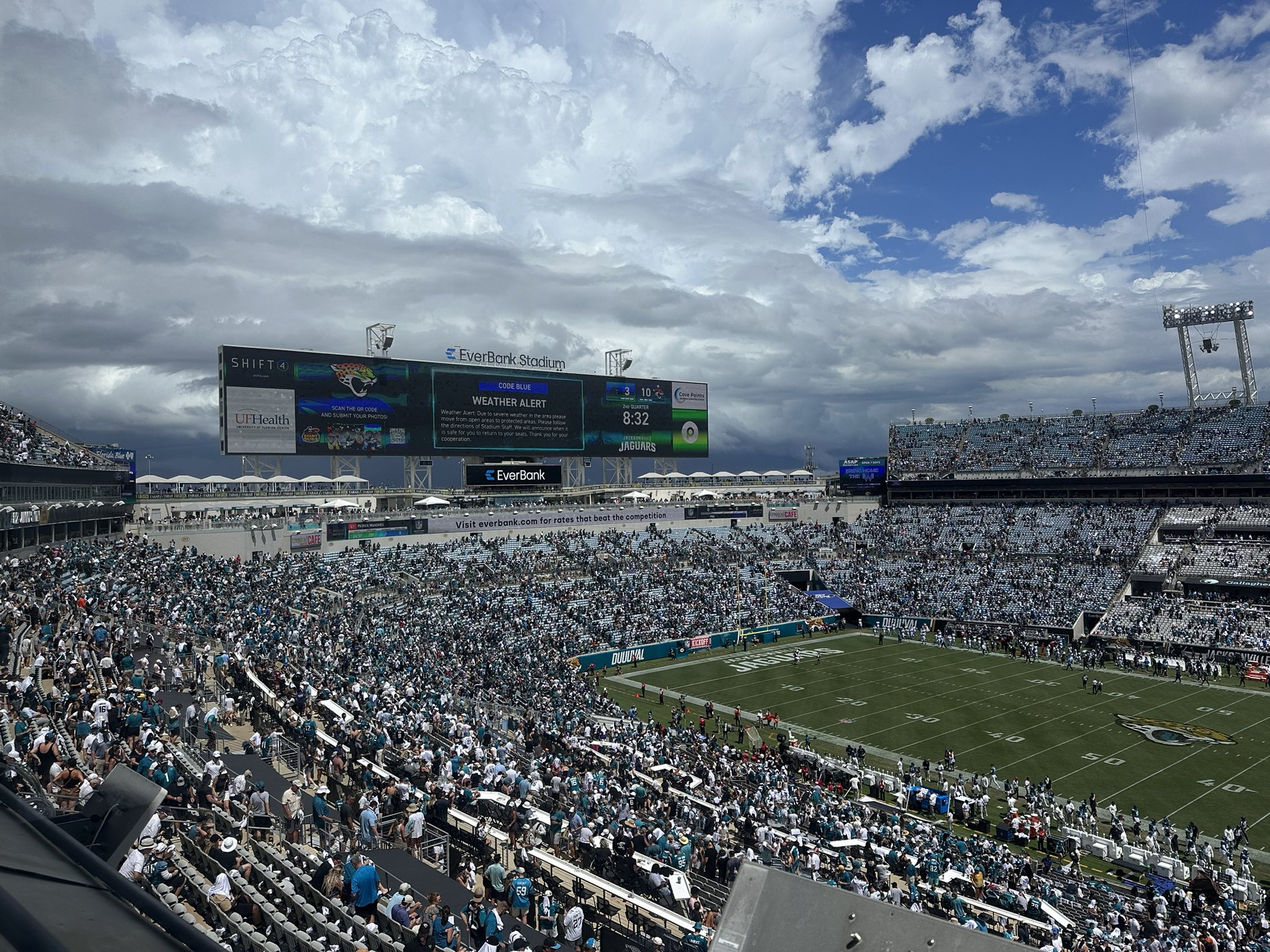 The official EverBank Stadium X account (formerly Twitter) posted an update:” SEVERE WEATHER ALERT All guests in open areas please shelter within the stadium facility until the all clear announcement.”
