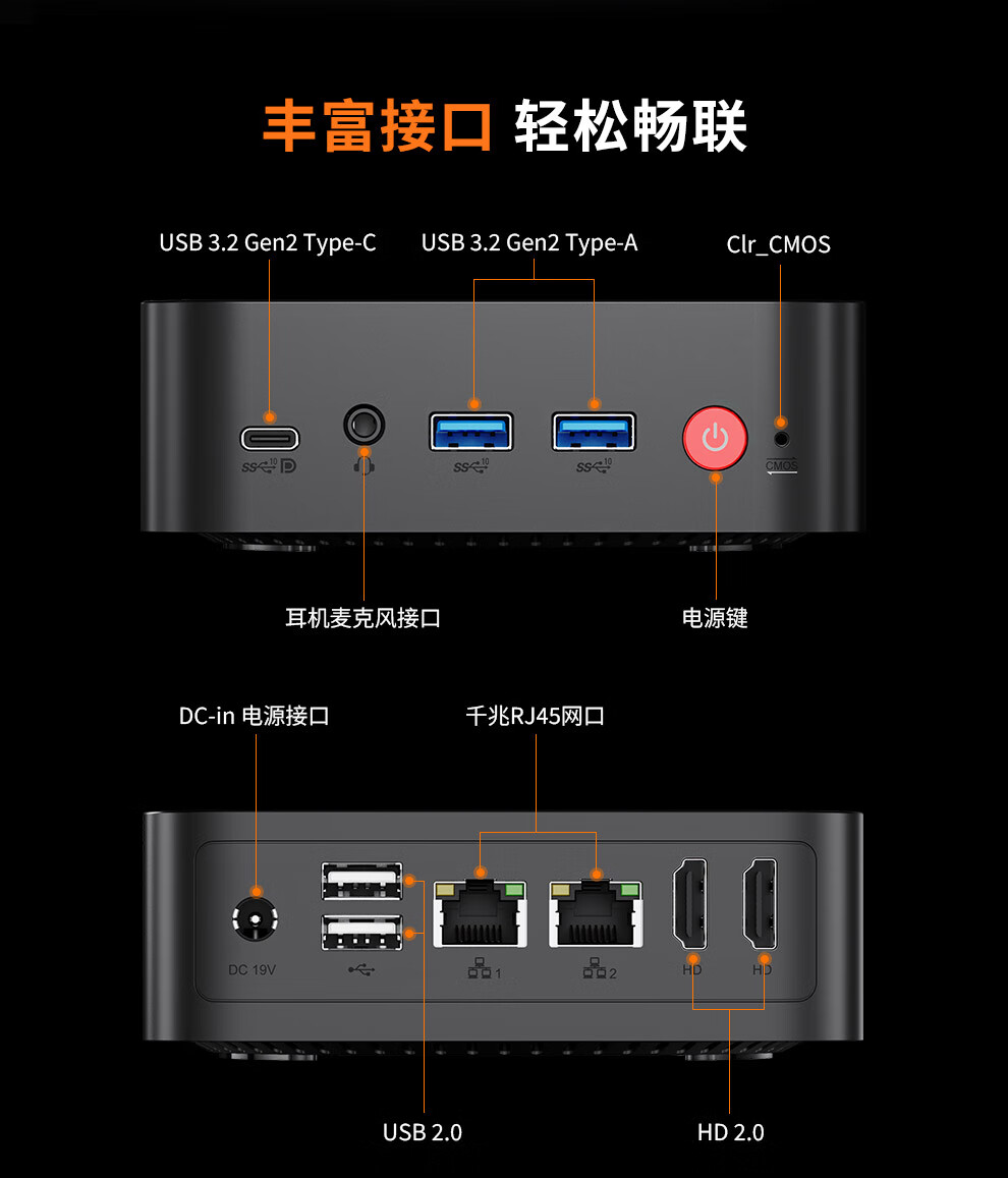 其外部正面提供 1 个 USB-C 10Gbps (DP 1.2 Alt)、2 个 USB-A 10Gbps、1 个二合一音频插孔、电源键;反面则包含 DC-in 电源接口、2 个 USB-A 480Mbps、2 个 1GbE RJ45、2 个 HDMI 2.0。