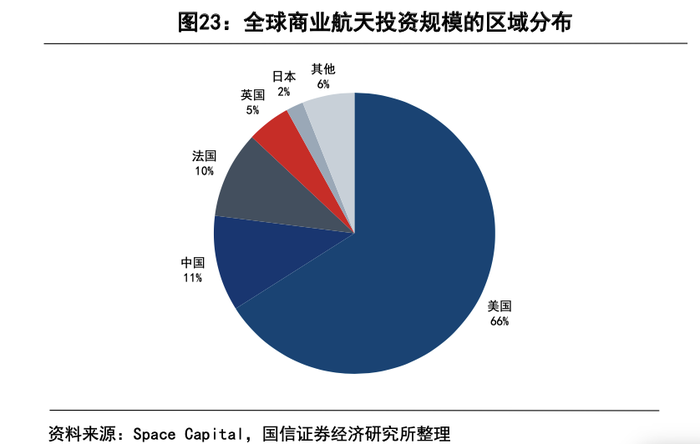 国信证券在近日研报中的统计数据显示,美国在过去十年中主导了全球商业航天领域的投资,占比66%;中国位居第二,占比11%,并将进一步加快对小型发射、卫星通信等的投资额;法国紧随其后,排名第三,占比10%。此后是英国占比5%、日本占比2%。