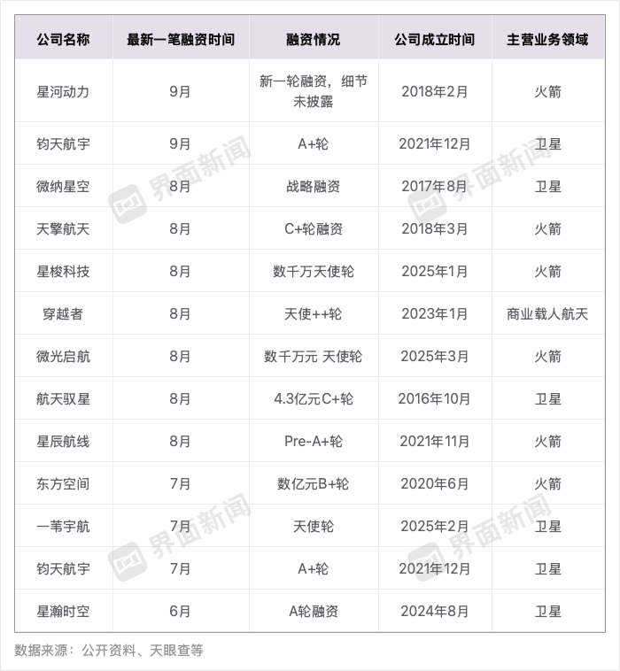 据界面新闻综合IT桔子等各方机构的数据,今年至今的八个多月内,商业航天板块发生了超过40起融资事件,已经超过去年全年的35起。