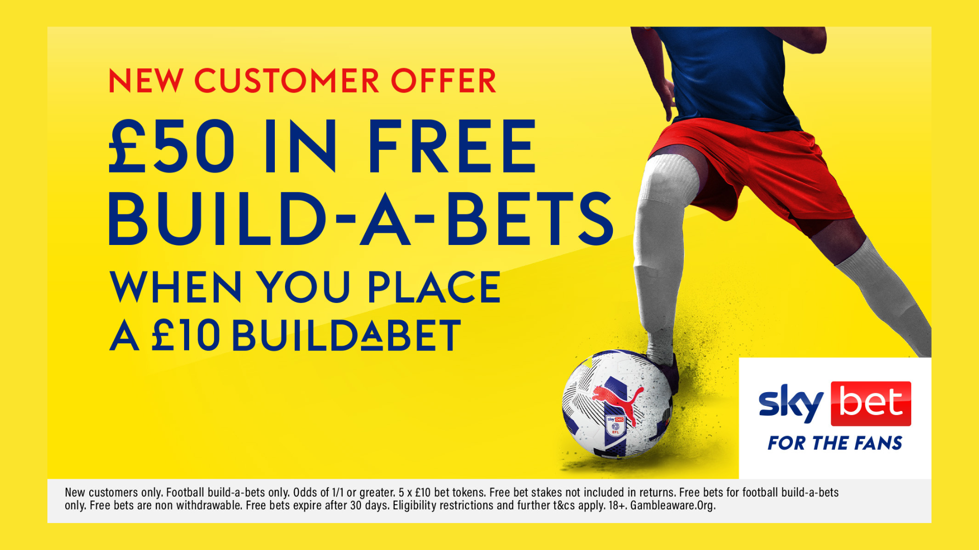 Sky Bet are offering new customers £50 in free bets to use on BuildABets to those who place a £10 BuildABet on any of this season’s football, an offer which can be claimed by following this link*.