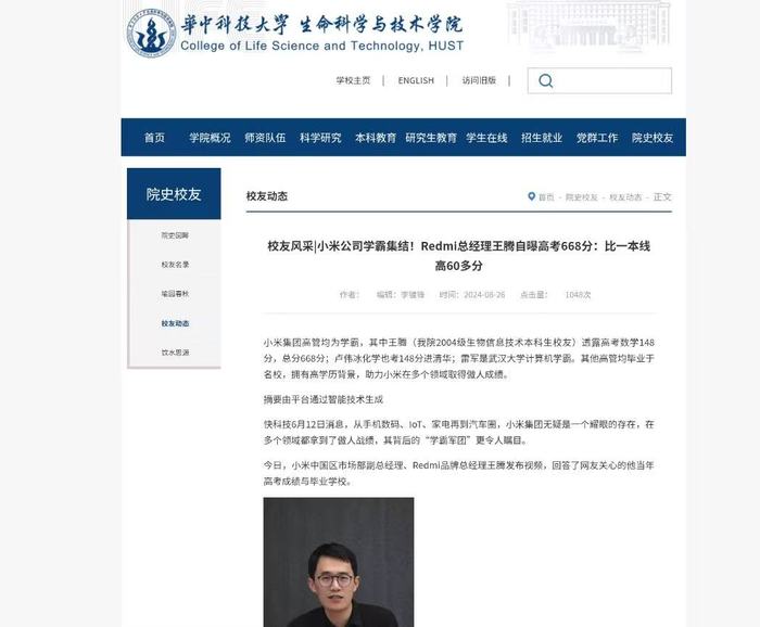 99日,据第一财经,王腾毕业母校华中科技大学官网校友动态栏目上午仍保留其相关宣传资料页面,但之后该页面被校方撤下。下图是其未撤除前页面截图: