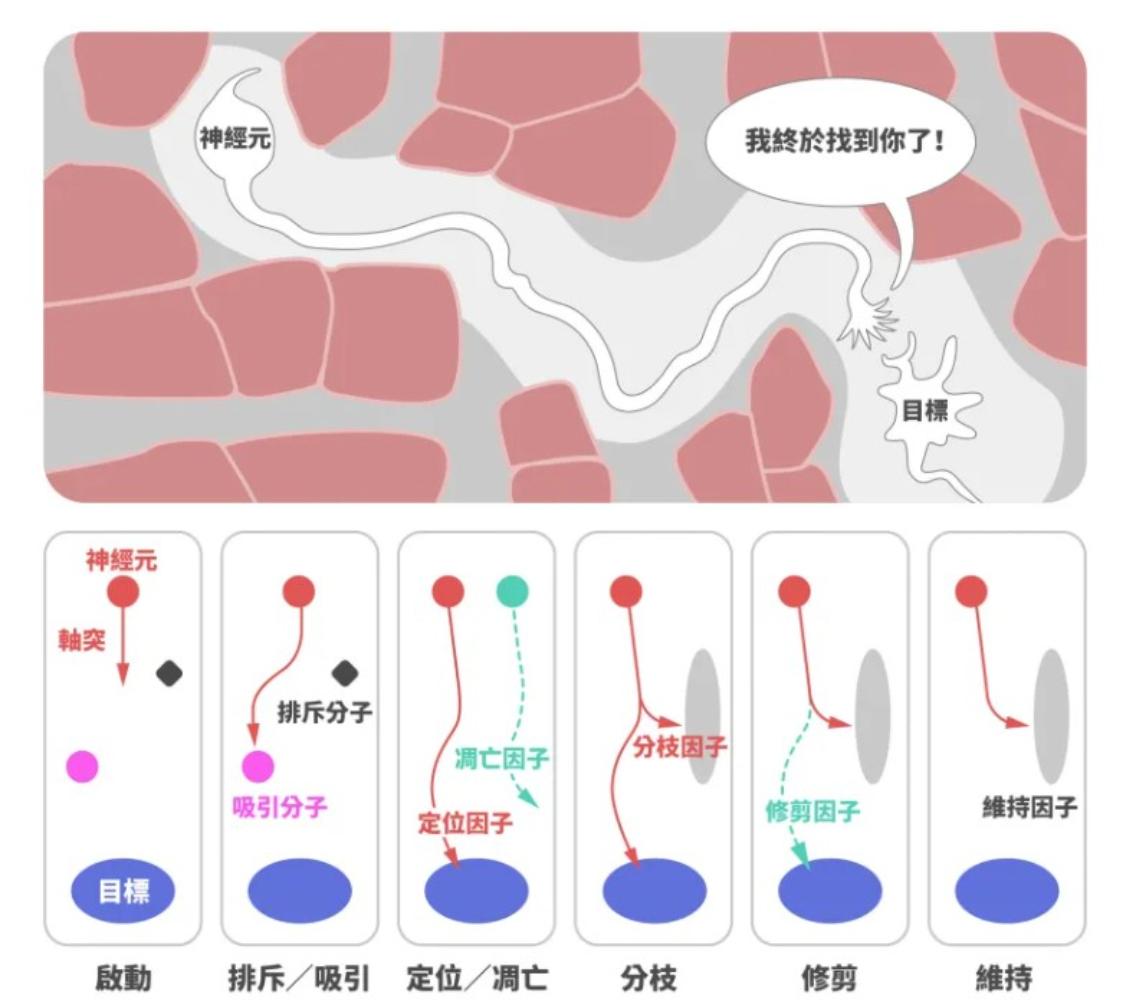 神經元軸突如何找到一生至愛?透過生長錐往前探索的過程中,會受到不同分子的吸引和排斥。剛開始建立神經連結時,軸突也可能出現分枝,轉移到真正目的地。一旦建立起真正連結,就會維持終生。(圖|研之有物,資料來源|程淮榮)