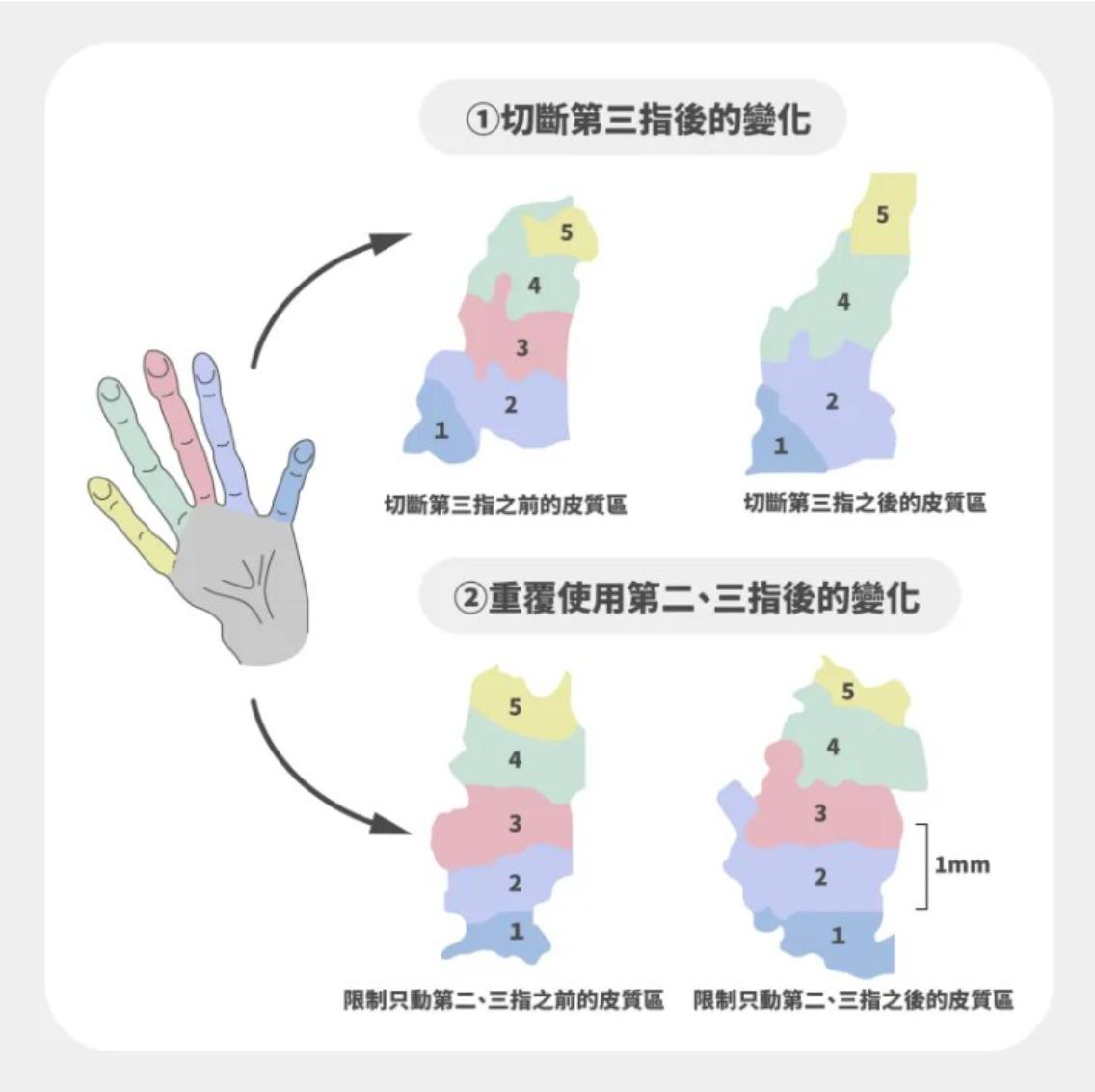 猴子手指運動與相應的大腦皮質區域變化,說明成年腦部具有可塑性。第一個實驗切斷猴子第三指之後,可以看到第三根手指對應的皮質區消失了。第二個實驗只讓猴子第二、第三根手指活動,可以看到第二根手指和第三根手指的對應區域都變大。(圖|研之有物,資料來源|程淮榮)