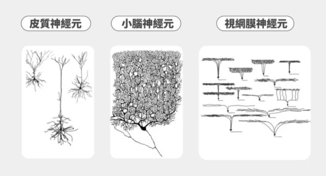這張圖顯示神經元有不同構造,由左而右為:皮質神經元(Cortex)、小腦神經元(Cerebellum)以及視網膜神經元(Retina)。圖中神經元類型屬於投射神經元,軸突訊號將發送到細胞體之外,把訊息「投射」到遠處的神經元。(圖|Current Biology)